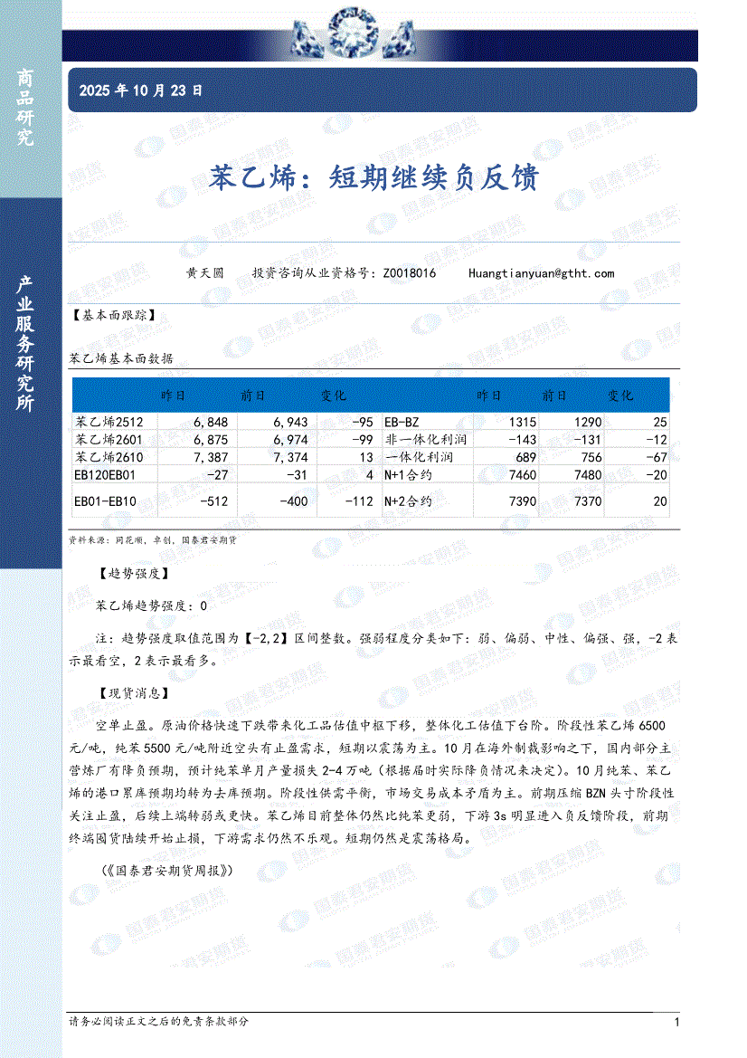 国泰君安期货-苯乙烯:短期继续负反馈-251023