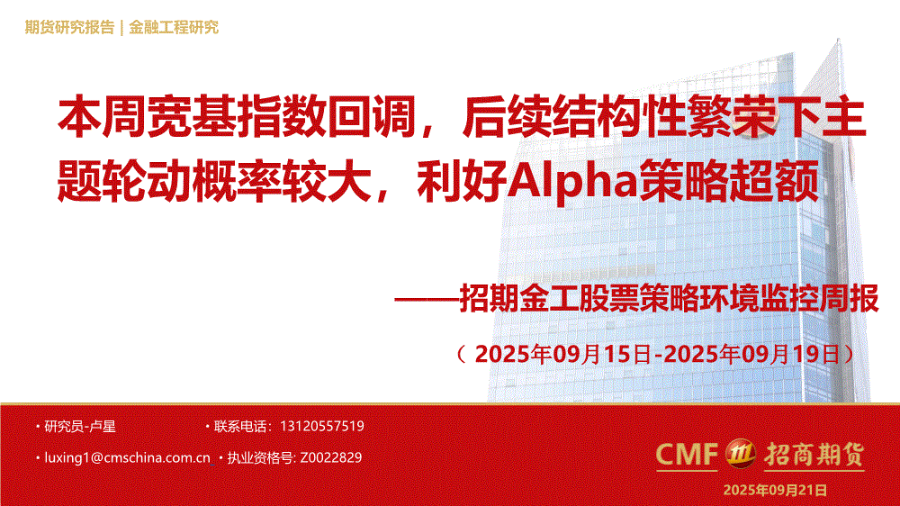 招商期货-招期金工股票策略环境监控周报:本周宽基指数回调,后续结构性繁荣下主题轮动概率较大,利好Alpha策略超额-250921