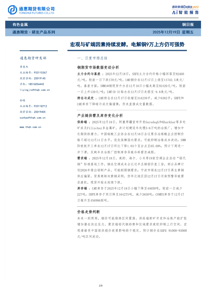 通惠期货-铜日报:宏观与矿端因素持续发酵,电解铜9万上方仍可强势-251219
