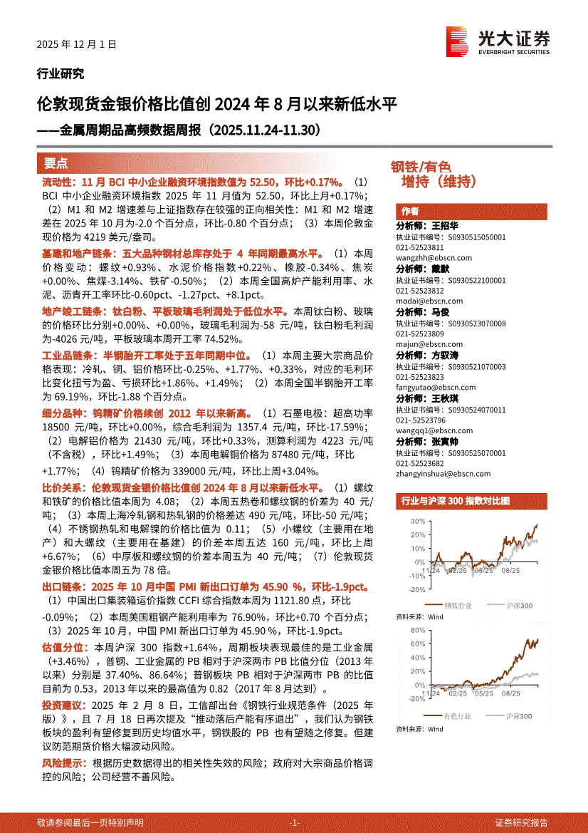 钢铁/有色行业:光大证券-钢铁/有色行业金属周期品高频数据周报:伦敦现货金银价格比值创2024年8月以来新低水平-251201