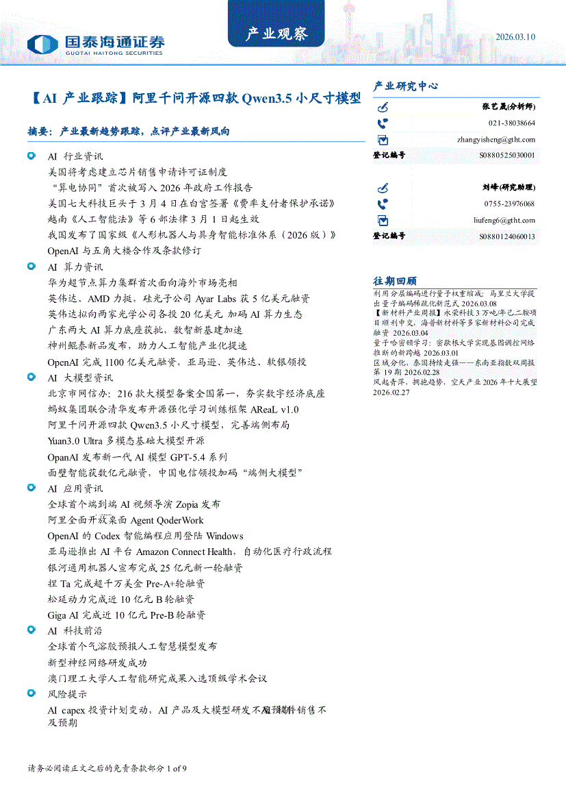 国泰海通证券-产业观察:【AI产业跟踪】阿里千问开源四款Qwen3.5小尺寸模型-260310