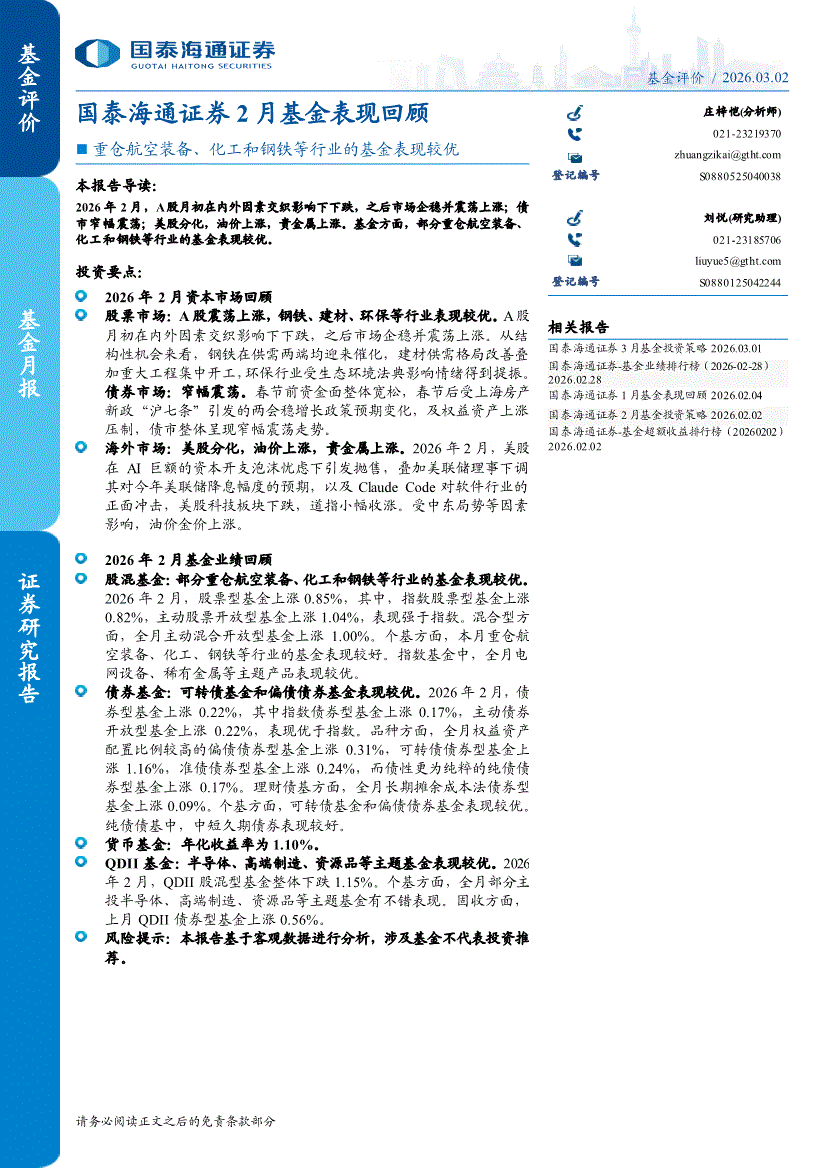国泰海通证券-2月基金表现回顾:重仓航空装备、化工和钢铁等行业的基金表现较优-260302