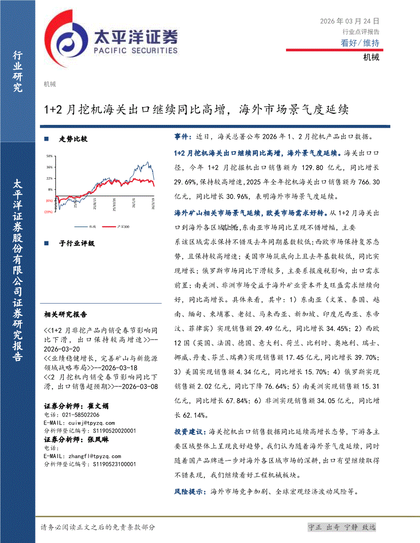 机械行业:太平洋证券-机械行业:1+2月挖机海关出口继续同比高增,海外市场景气度延续-260324