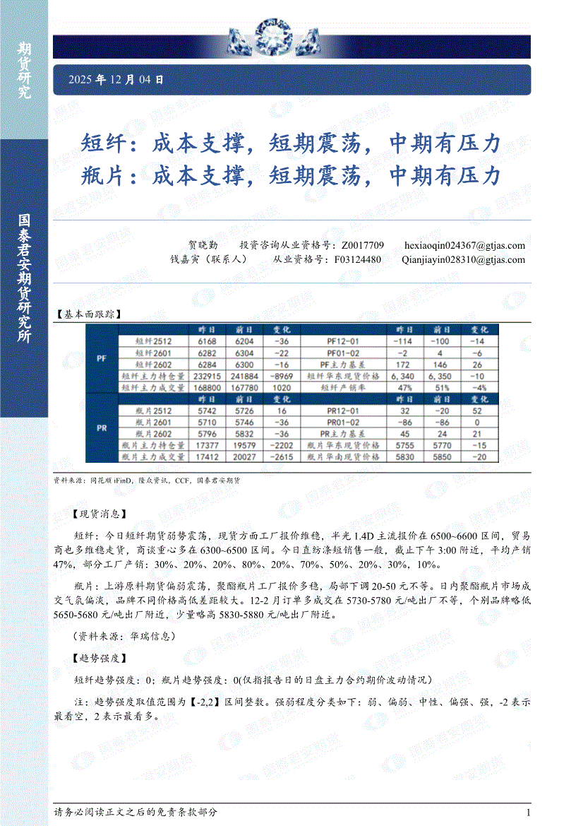 国泰君安期货-短纤:成本支撑,短期震荡,中期有压力,瓶片,成本支撑,短期震荡,中期有压力-251202