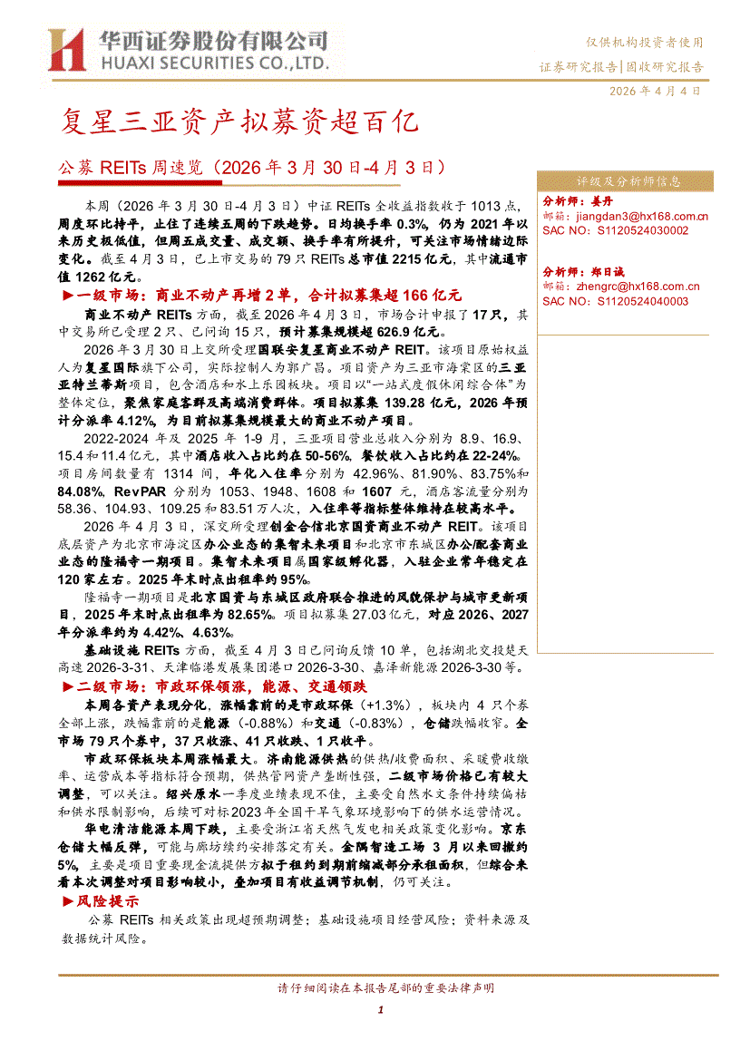 华西证券-公募REITs周速览(2026年3月30日~4月3日):复星三亚资产拟募资超百亿-260404