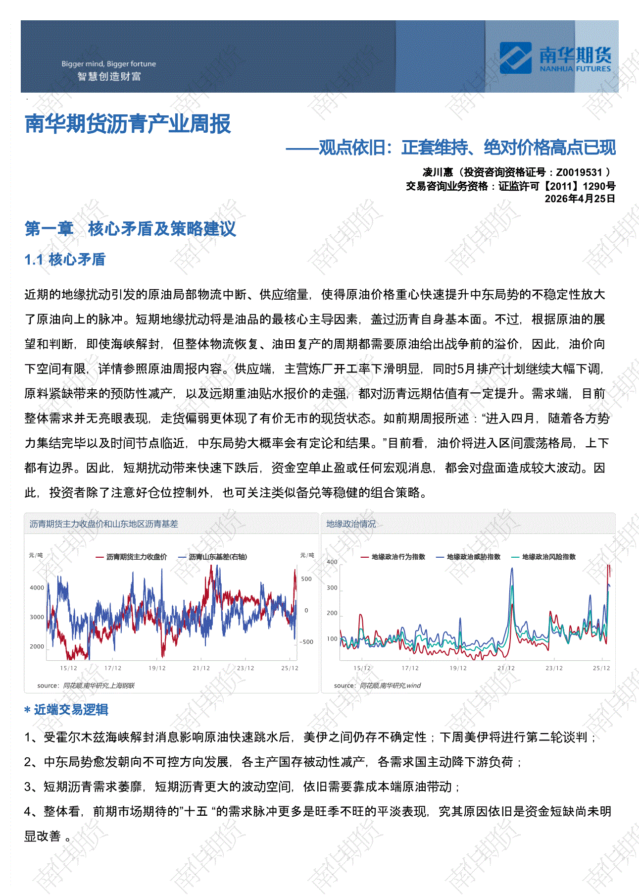 南华期货-沥青产业周报:观点依旧,正套维持,但绝对价格高点已见-260425