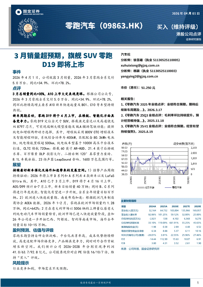 零跑汽车:国金证券-零跑汽车-9863.HK-3月销量超预期,旗舰SUV零跑D19即将上市-260401
