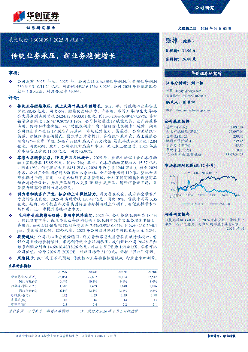 晨光股份:华创证券-晨光股份-603899-2025年报点评:传统业务承压,新业务稳健增长-260403