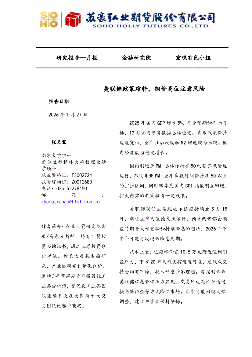 弘业期货-美联储政策难料,铜价高位注意风险-260127