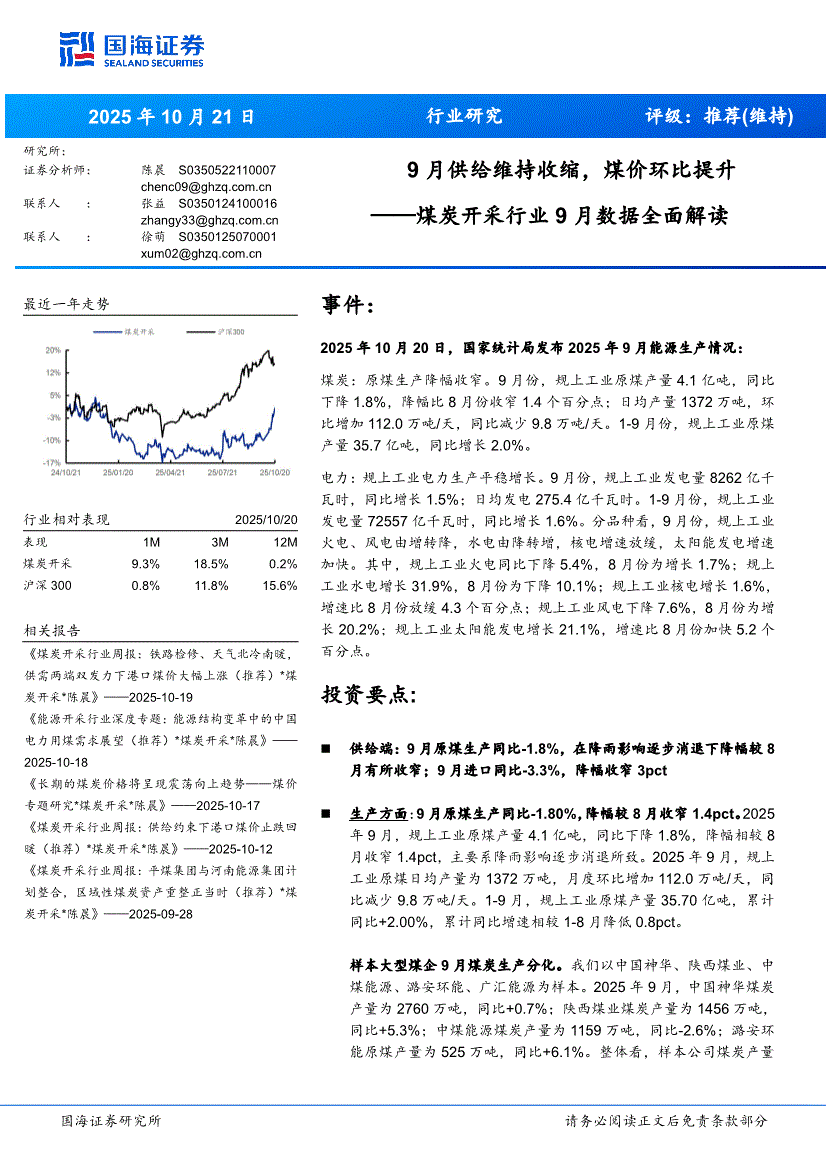 煤炭开采行业:国海证券-煤炭开采行业9月数据全面解读:9月供给维持收缩,煤价环比提升-251021