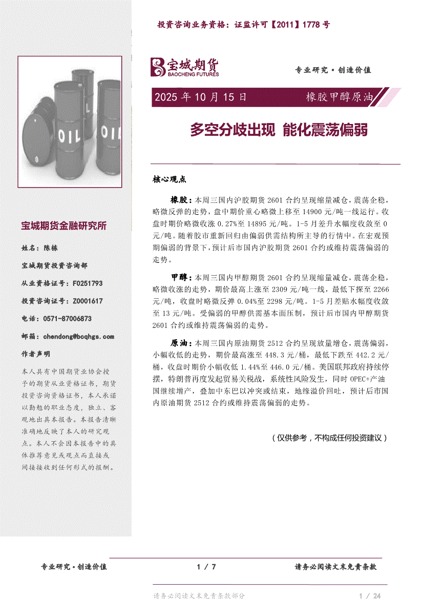 宝城期货-橡胶甲醇原油日报:多空分歧出现,能化震荡偏弱-251015