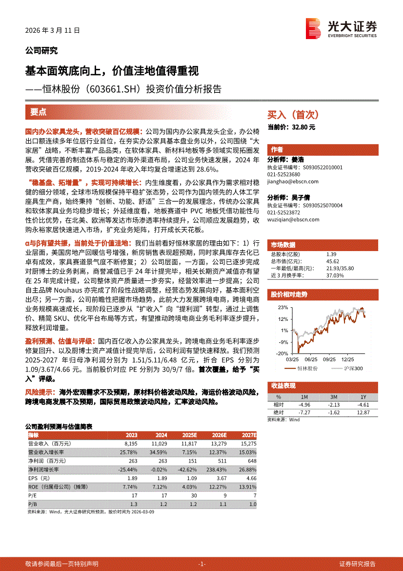恒林股份:光大证券-恒林股份-603661-投资价值分析报告:基本面筑底向上,价值洼地值得重视-260311
