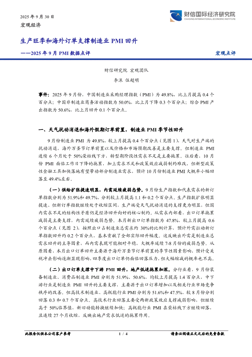财信国际经济研究院-2025年9月PMI数据点评:生产旺季和海外订单支撑制造业PMI回升-250930
