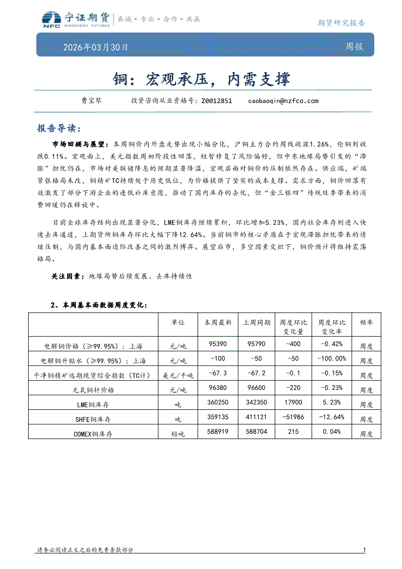 宁证期货-铜:宏观承压,内需支撑-260330