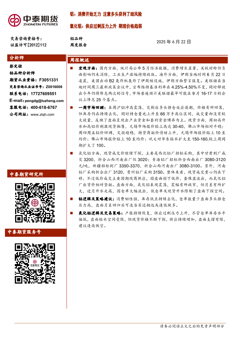 中泰期货-铝品种周度报告:铝,消费疲软支撑难,挤仓预期减弱,氧化铝,过剩预期压制,短期现货支撑-250706