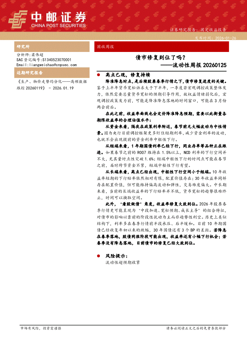 中邮证券-流动性周报:债市修复到位了吗?-260126