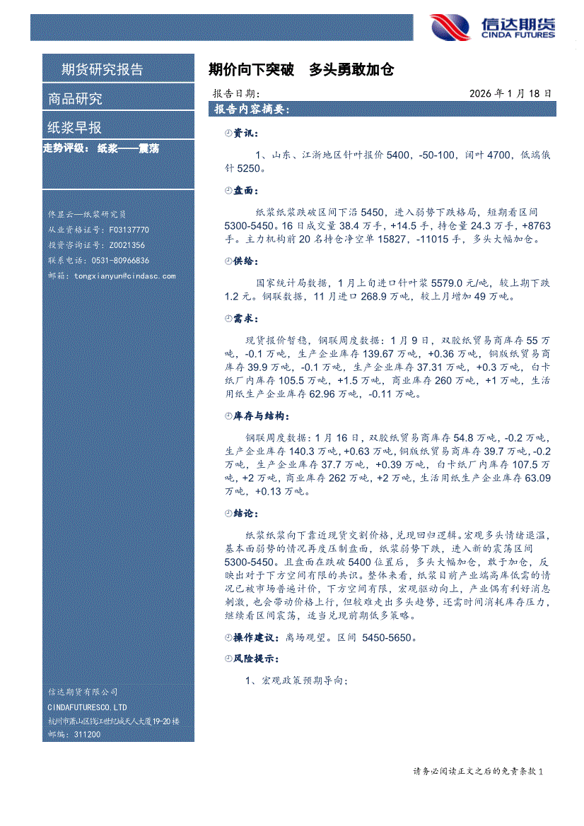 信达期货-纸浆早报:期价向下突破,多头勇敢加仓-260118