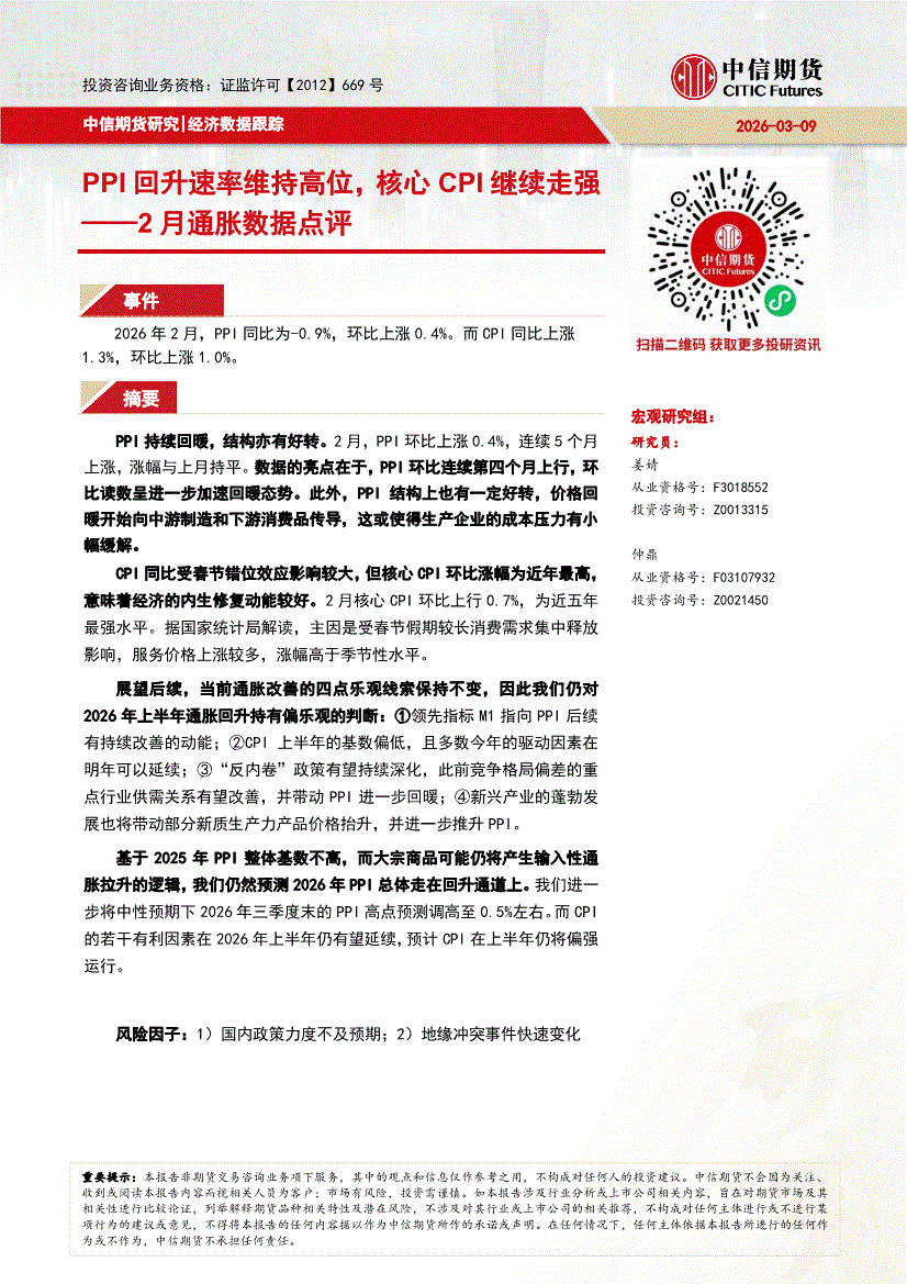 中信期货-2月通胀数据点评:PPI回升速率维持高位,核心CPI继续走强-260309