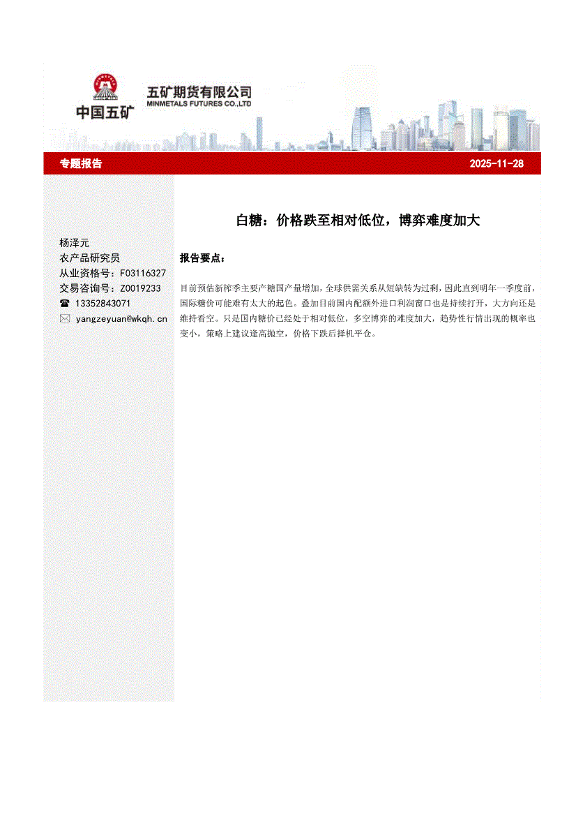 五矿期货-白糖:价格跌至相对低位,博弈难度加大-251128