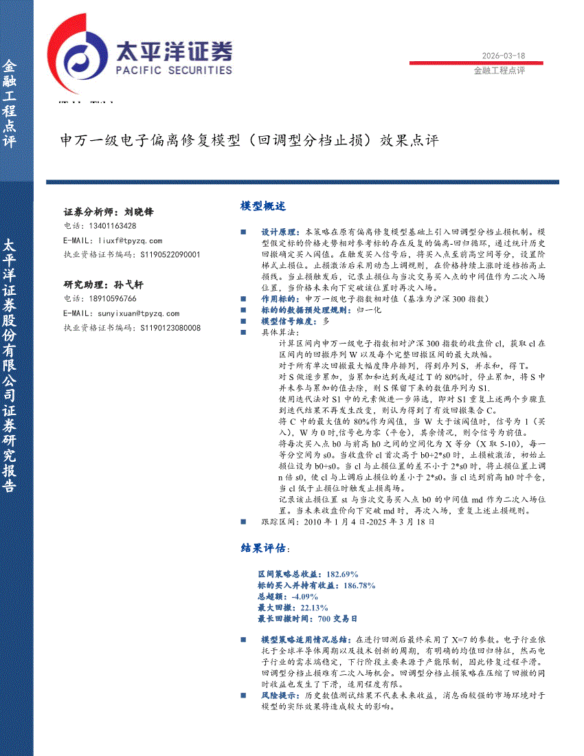 太平洋证券-申万一级电子偏离修复模型(回调型分档止损)效果点评-260318