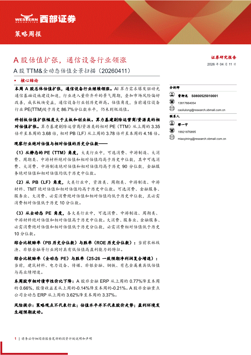 西部证券-A股TTM&全动态估值全景扫描:A股估值扩张,通信设备行业领涨-260411