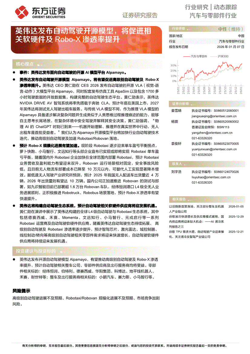 汽车与零部件行业:东方证券-汽车与零部件行业动态跟踪:英伟达发布自动驾驶开源模型,将促进相关软硬件及Robo~X渗透率提升-260107