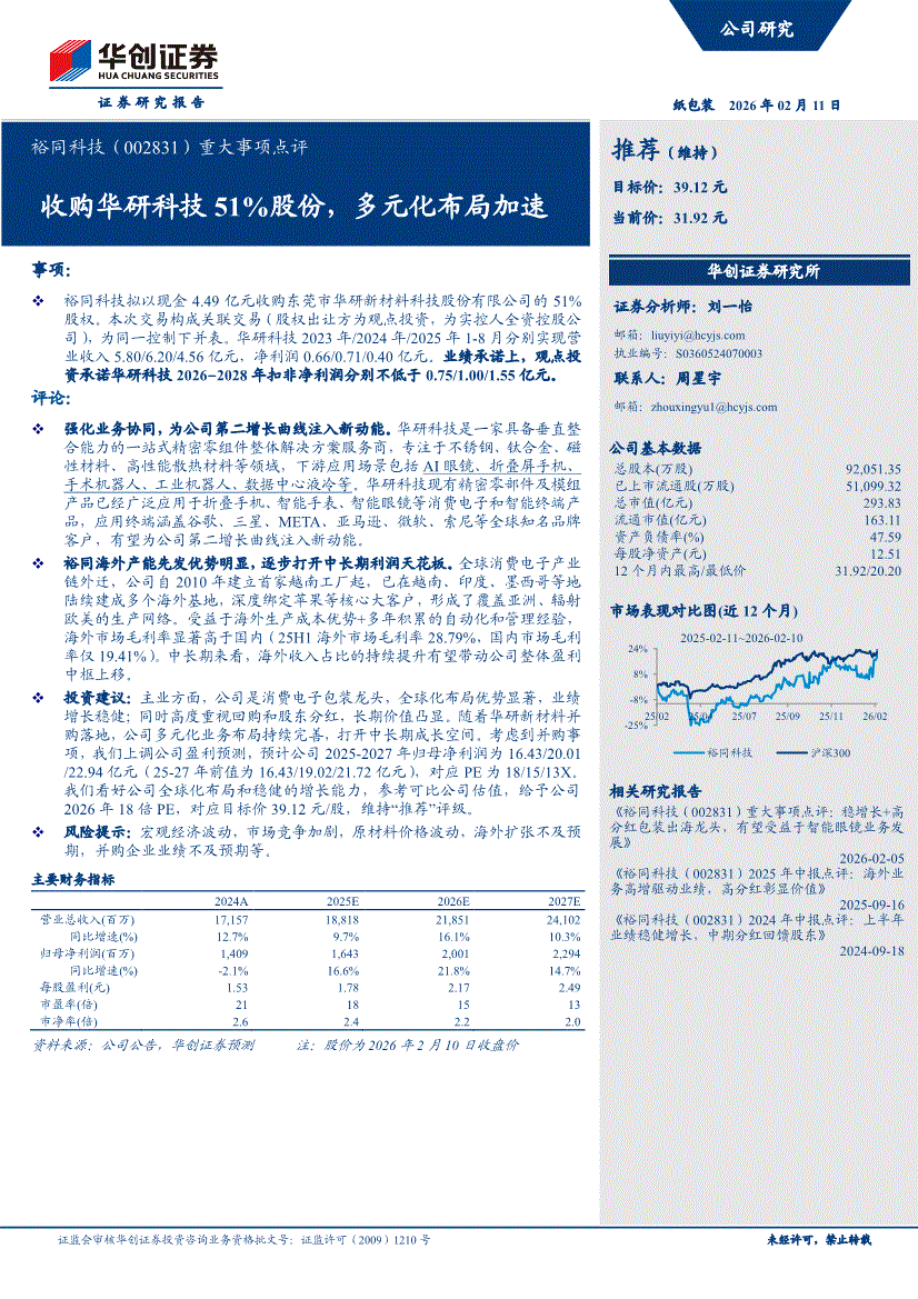 裕同科技:华创证券-裕同科技-002831-重大事项点评:收购华研科技51%股份,多元化布局加速-260211