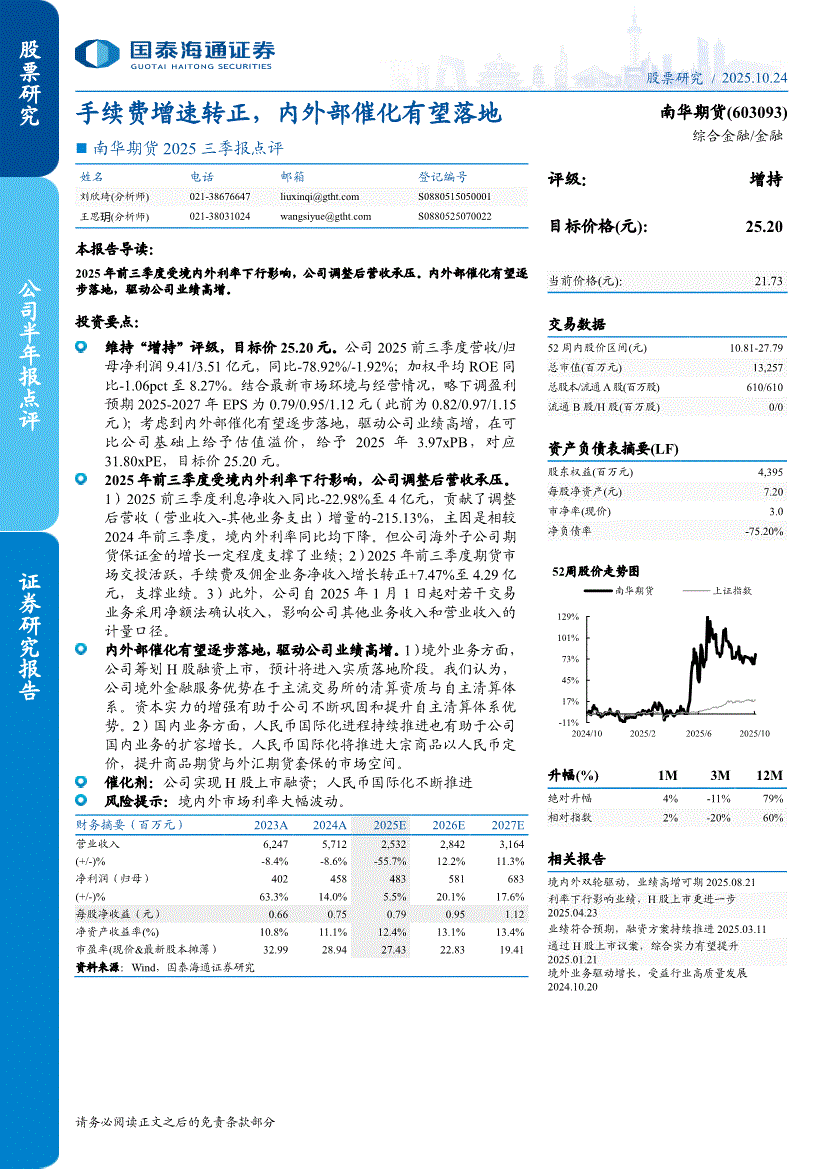 南华期货:国泰海通证券-南华期货-603093-2025三季报点评:手续费增速转正,内外部催化有望落地-251024