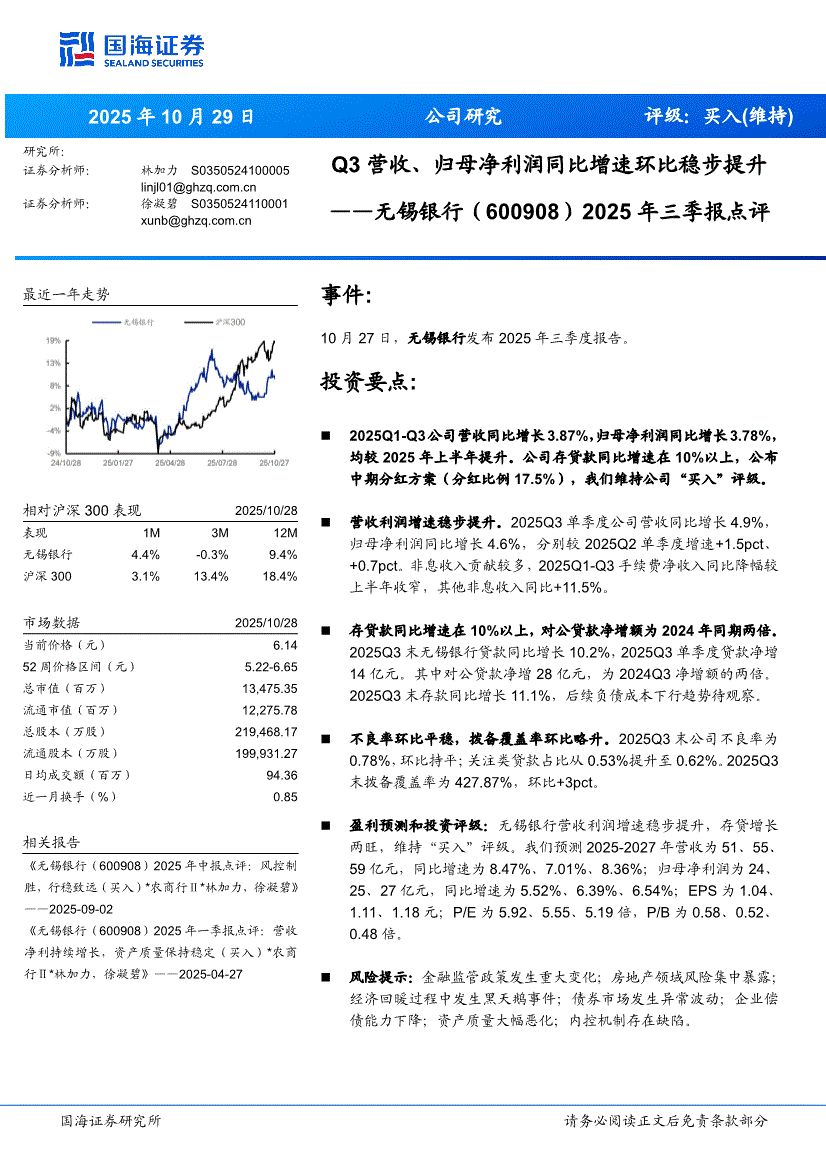 无锡银行:国海证券-无锡银行-600908-2025年三季报点评:Q3营收、归母净利润同比增速环比稳步提升-251029