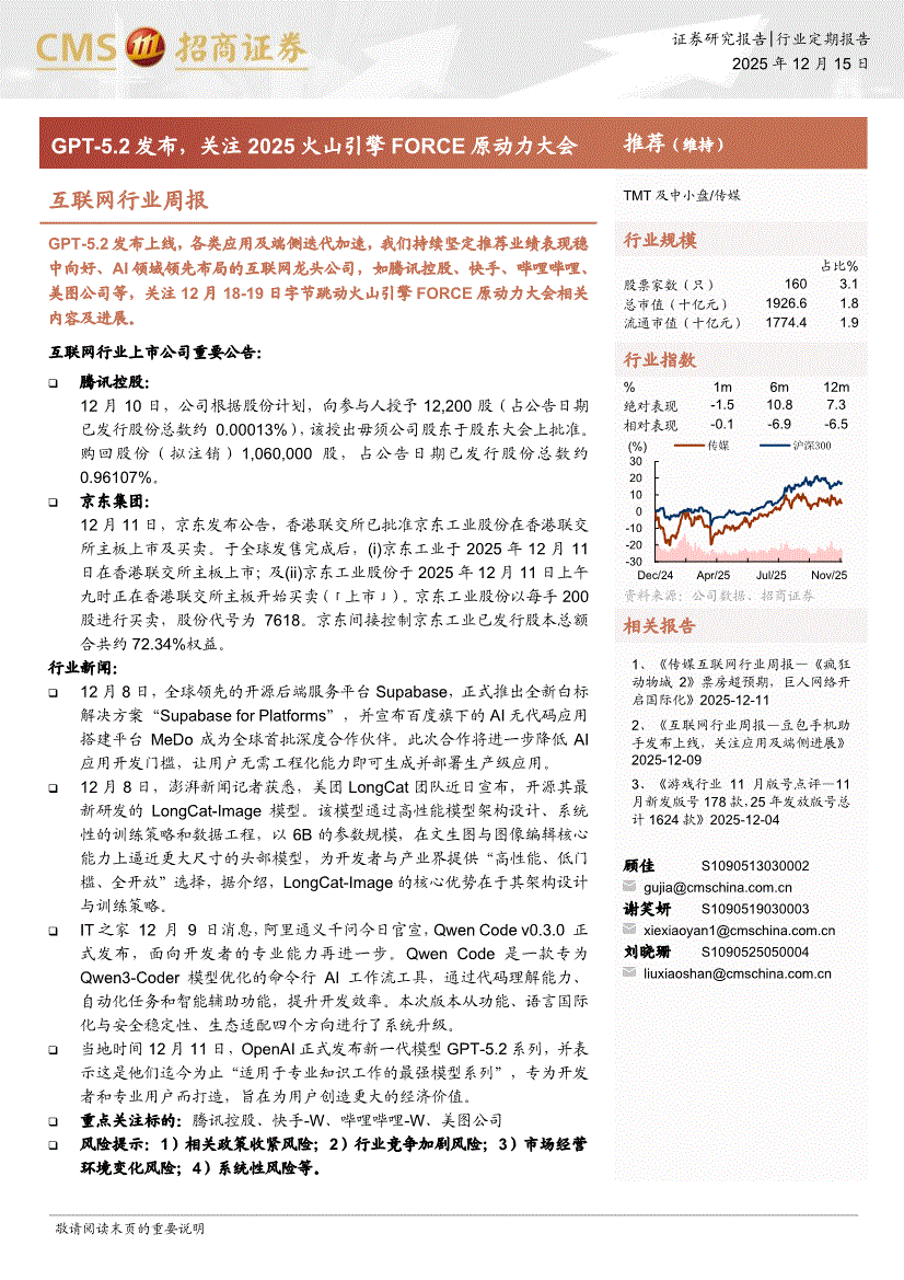 互联网行业:招商证券-互联网行业周报:GPT~5.2发布,关注2025火山引擎FORCE原动力大会-251215