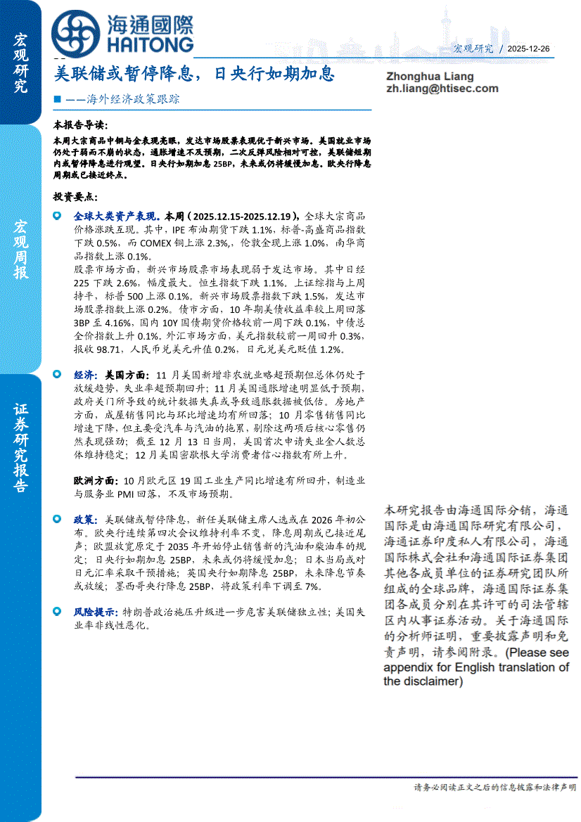 海通国际-海外经济政策跟踪:美联储或暂停降息,日央行如期加息-251226