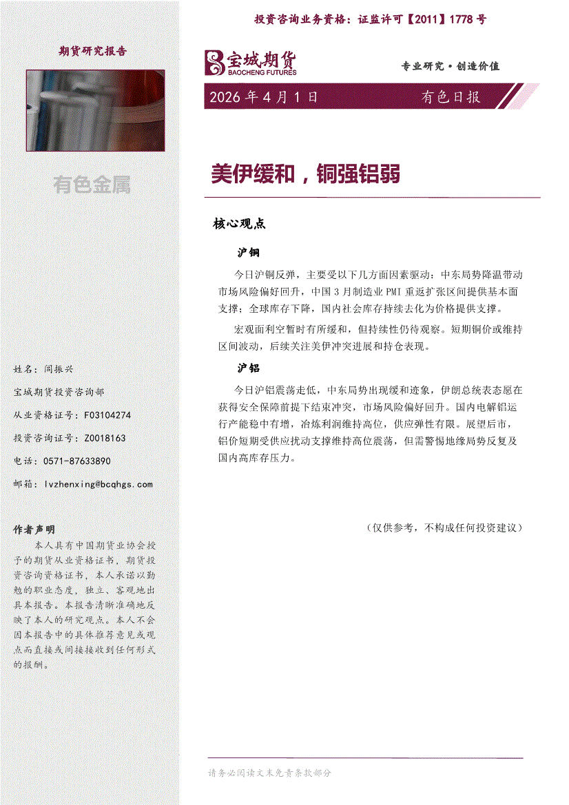 宝城期货-有色日报:美伊缓和,铜强铝弱-260401