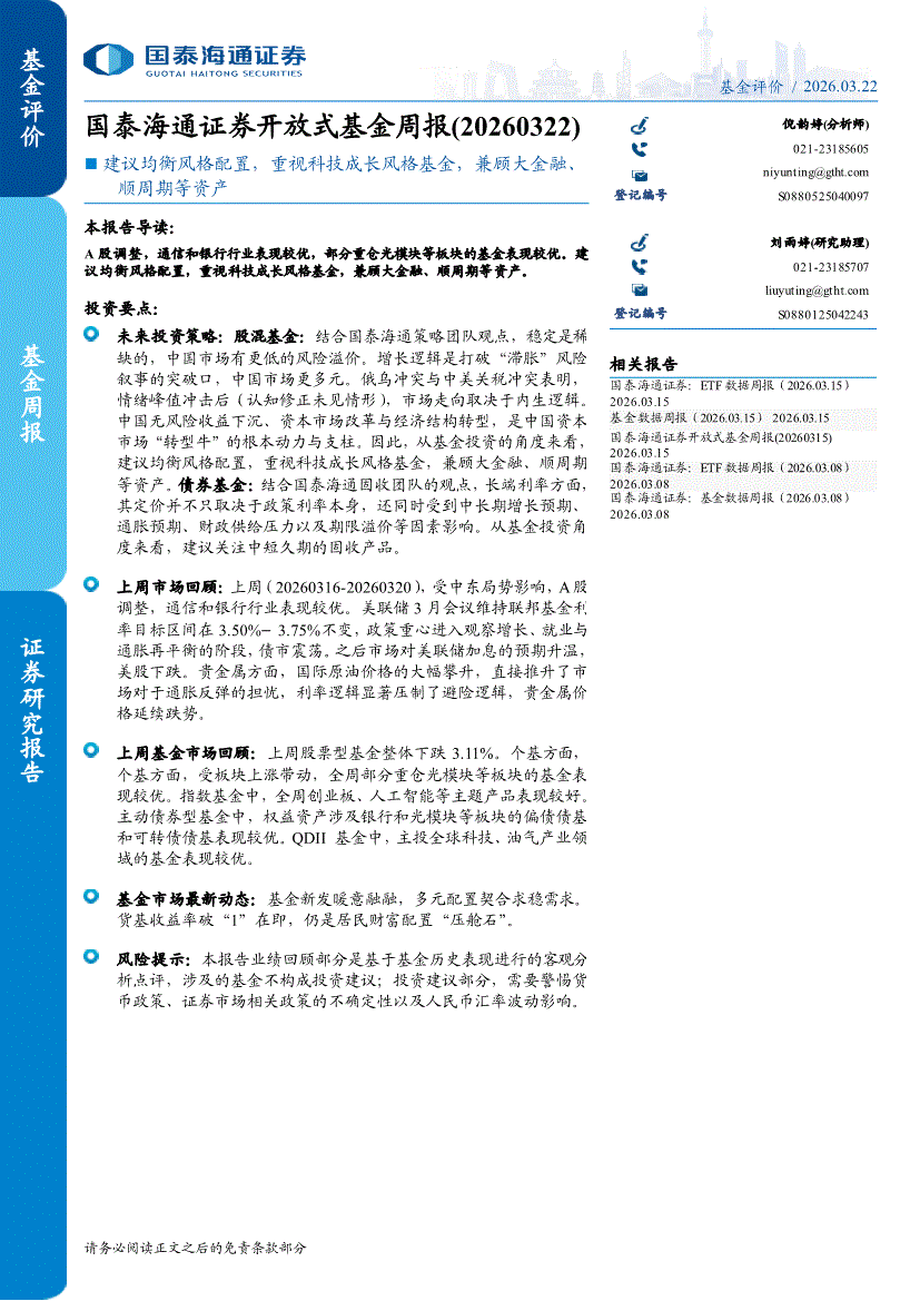 国泰海通证券-开放式基金周报:建议均衡风格配置,重视科技成长风格基金,兼顾大金融、顺周期等资产-260322