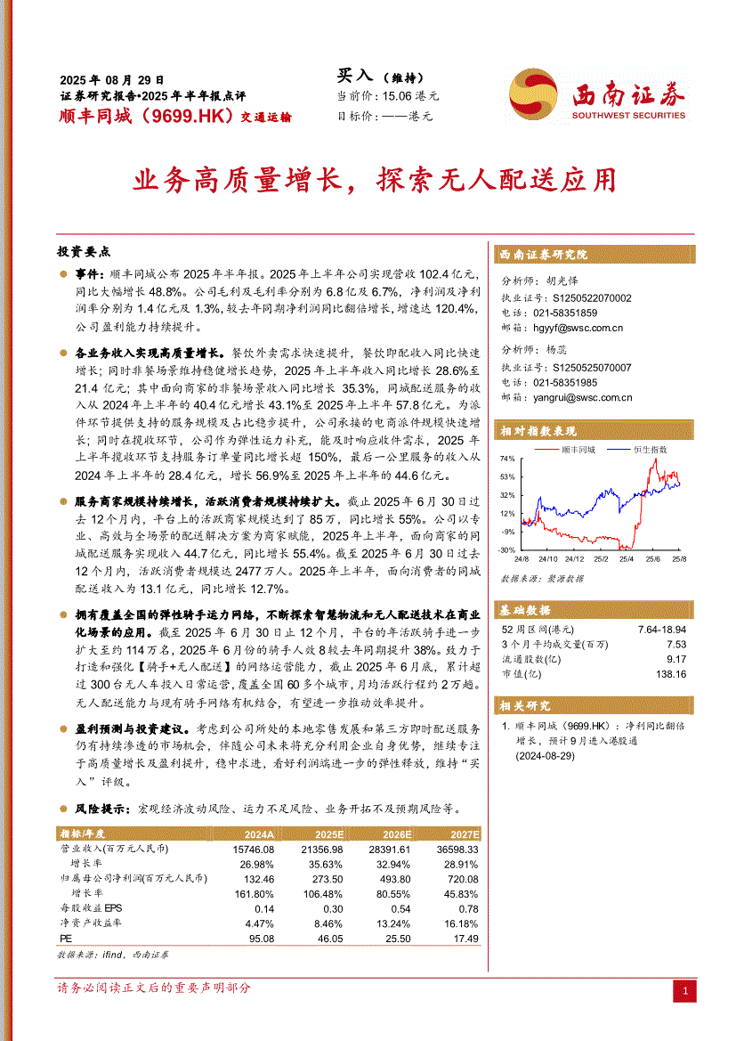 顺丰同城:西南证券-顺丰同城-9699.HK-业务高质量增长,探索无人配送应用-250829