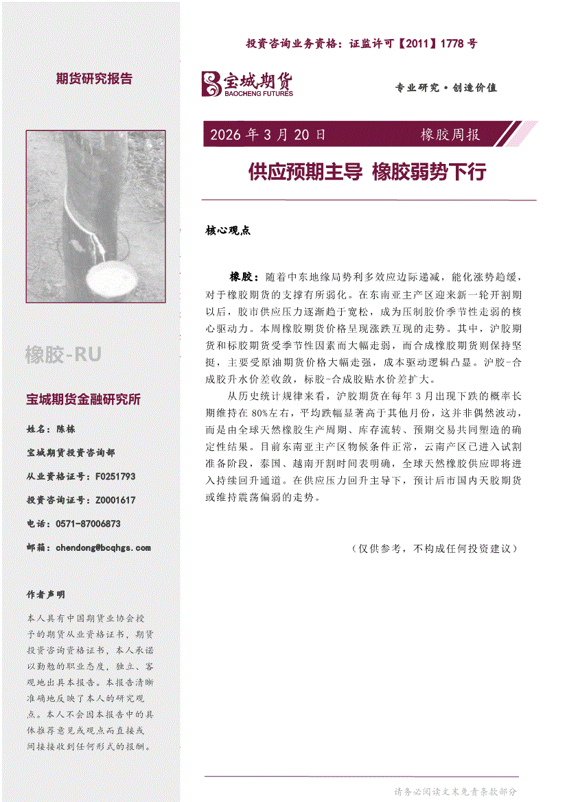 宝城期货-橡胶周报:供应预期主导,橡胶弱势下行-260320