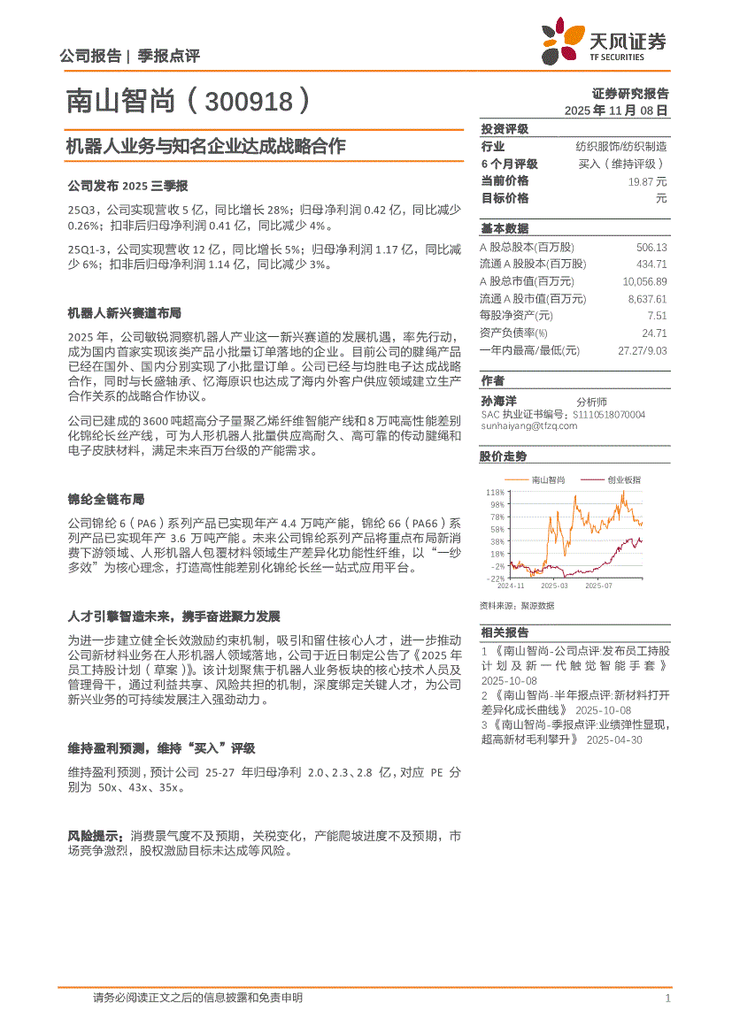 南山智尚:天风证券-南山智尚-300918-机器人业务与知名企业达成战略合作-251108