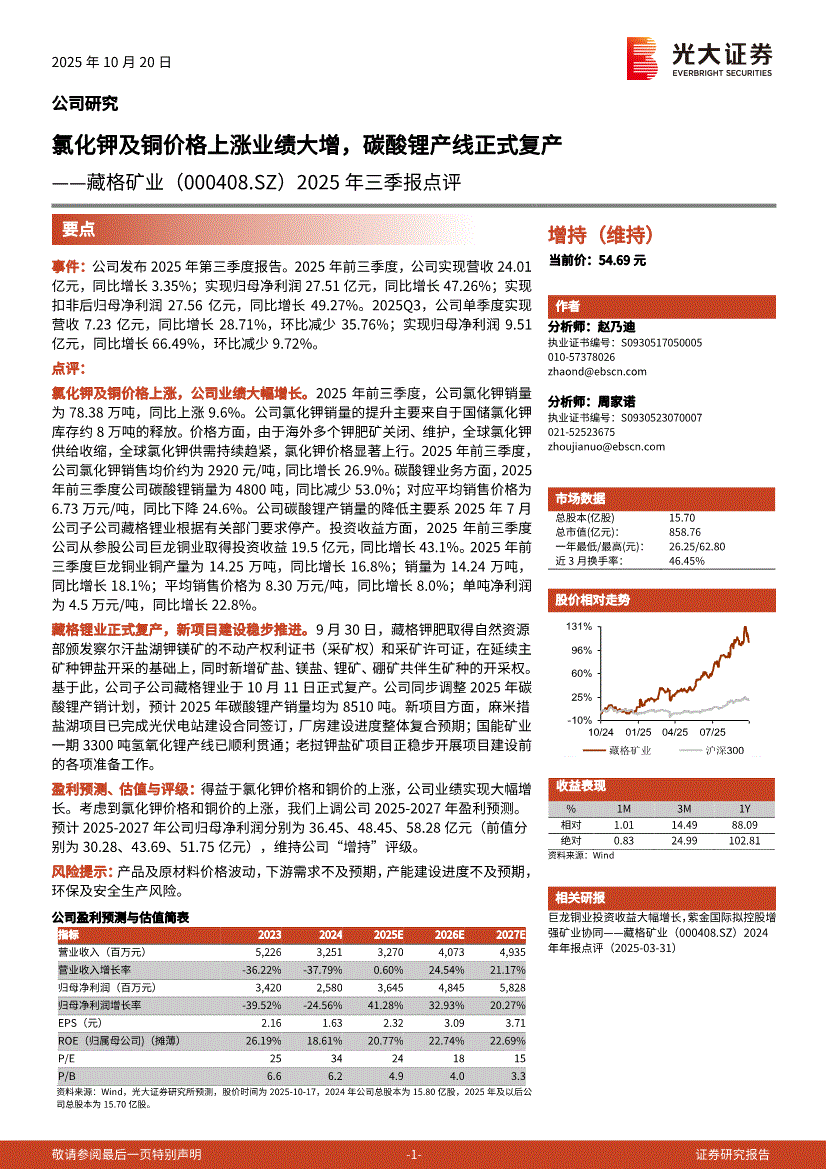 藏格矿业:光大证券-藏格矿业-000408-2025年三季报点评:氯化钾及铜价格上涨业绩大增,碳酸锂产线正式复产-251020