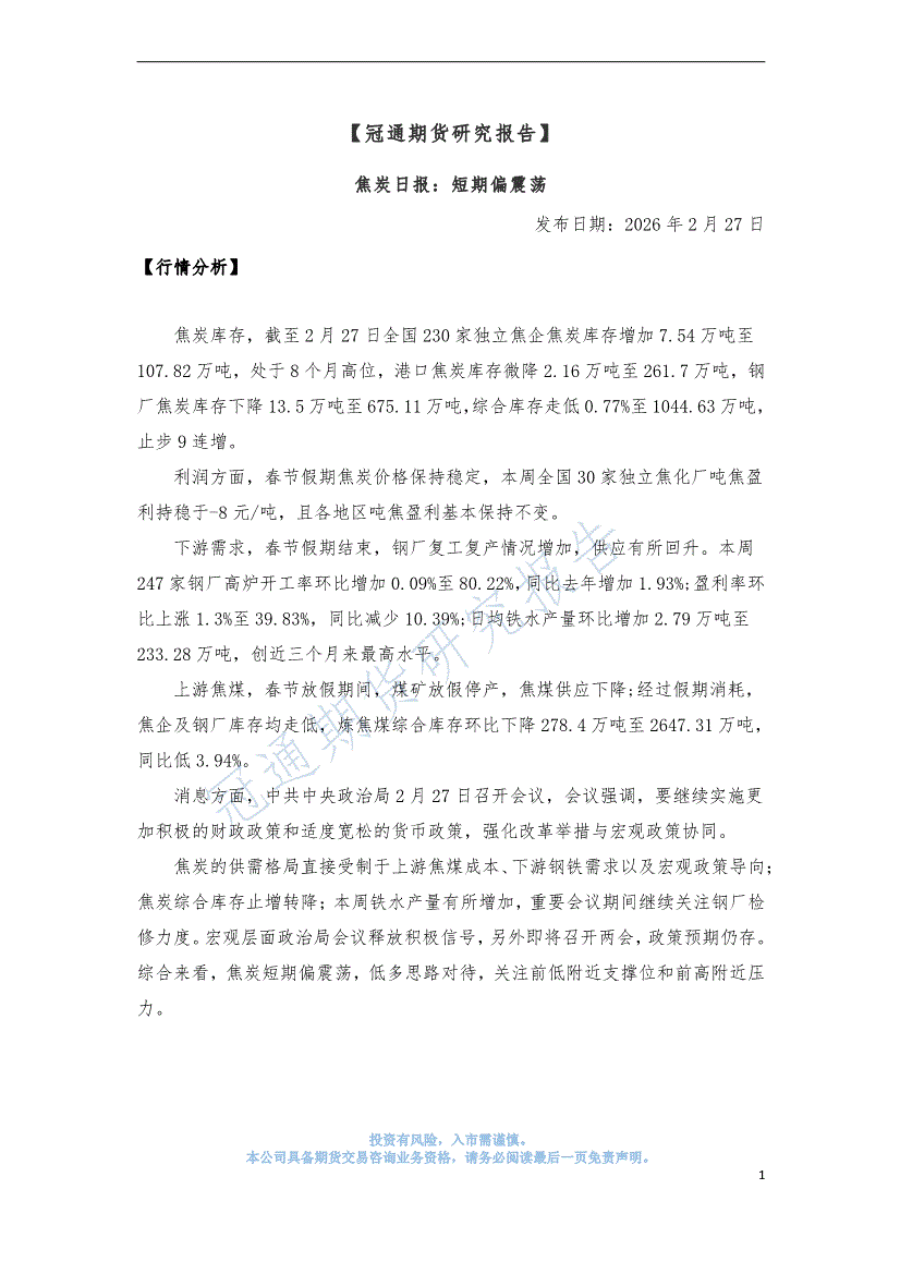 冠通期货-焦炭日报:短期偏震荡-260227