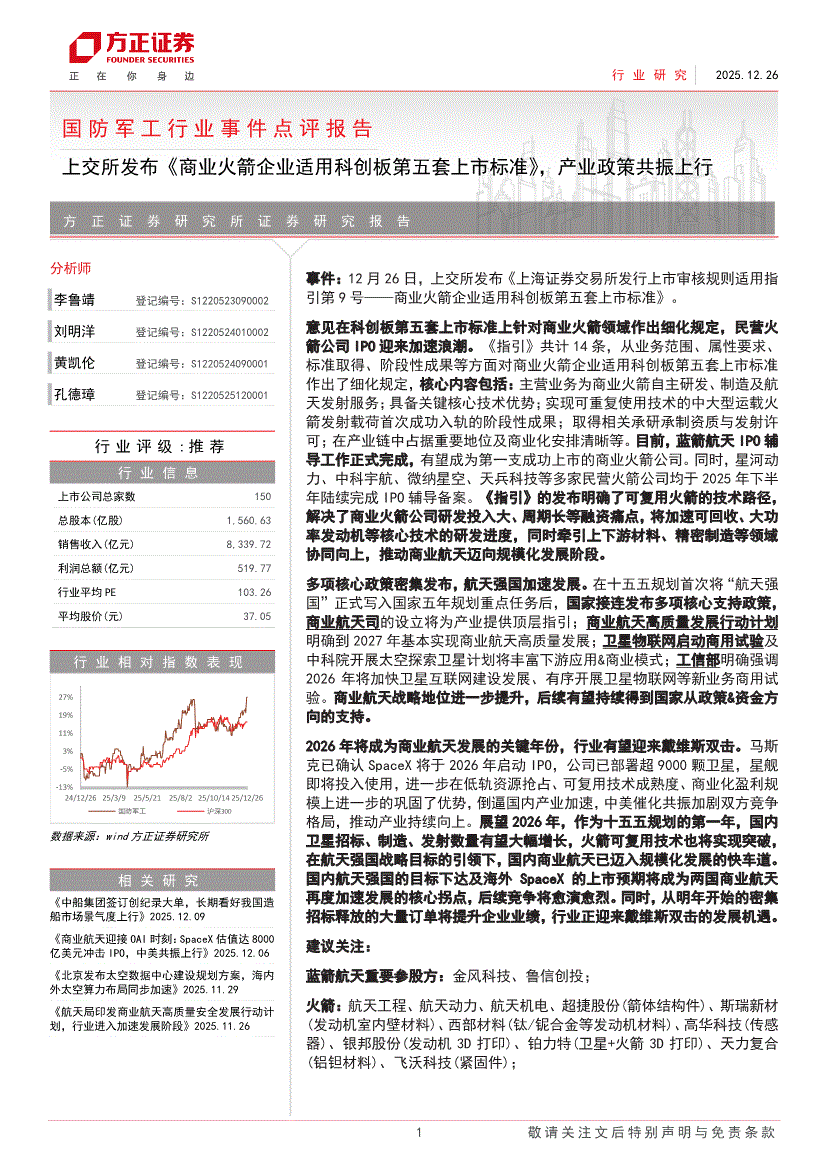 国防军工行业:方正证券-国防军工行业事件点评报告:上交所发布《商业火箭企业适用科创板第五套上市标准》,产业政策共振上行-251226