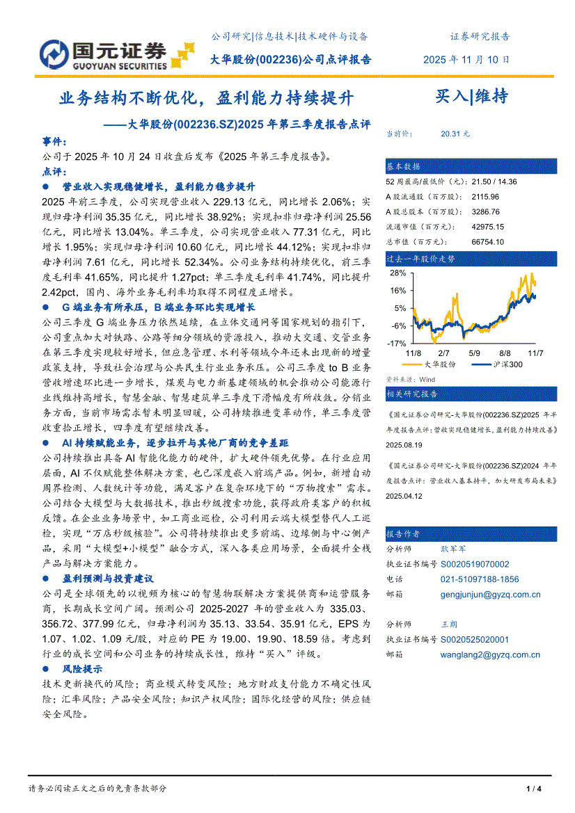 大华股份:国元证券-大华股份-002236-2025年第三季度报告点评:业务结构不断优化,盈利能力持续提升-251110