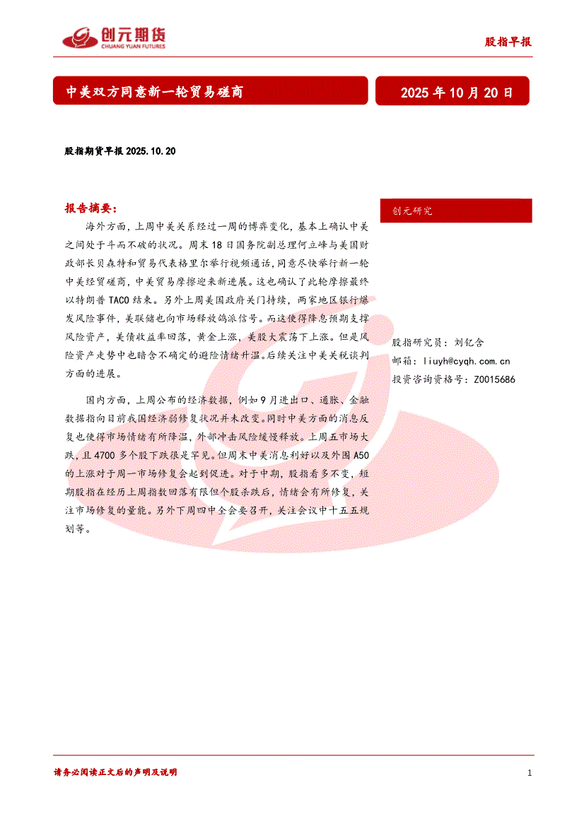 创元期货-股指期货早报:中美双方同意新一轮贸易磋商-251020