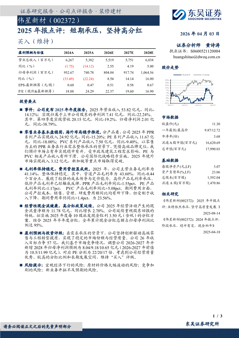 伟星新材:东吴证券-伟星新材-002372-2025年报点评:短期承压,坚持高分红-260403