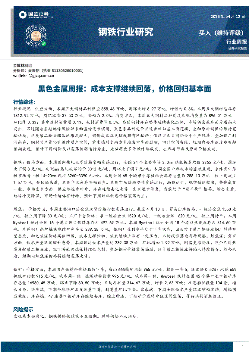 钢铁行业:国金证券-钢铁行业周报:黑色金属周报,成本支撑继续回落,价格回归基本面-260412