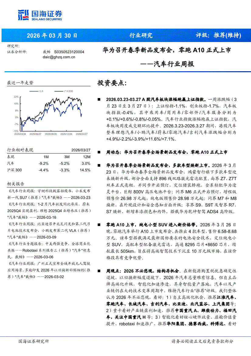 汽车行业:国海证券-汽车行业周报:华为召开春季新品发布会,零跑A10正式上市-260330