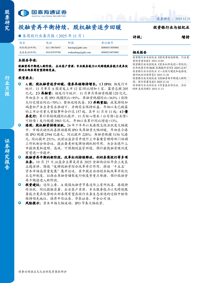投资银行业与经纪业行业:国泰海通证券-投资银行业与经纪业行业券商投行业务月报(2025年11月):投融资再平衡持续,股权融资逐步回暖-251222