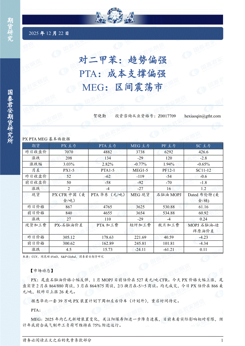 国泰君安期货-对二甲苯:趋势偏强,PTA,成本支撑偏强,MEG,区间震荡市-251222