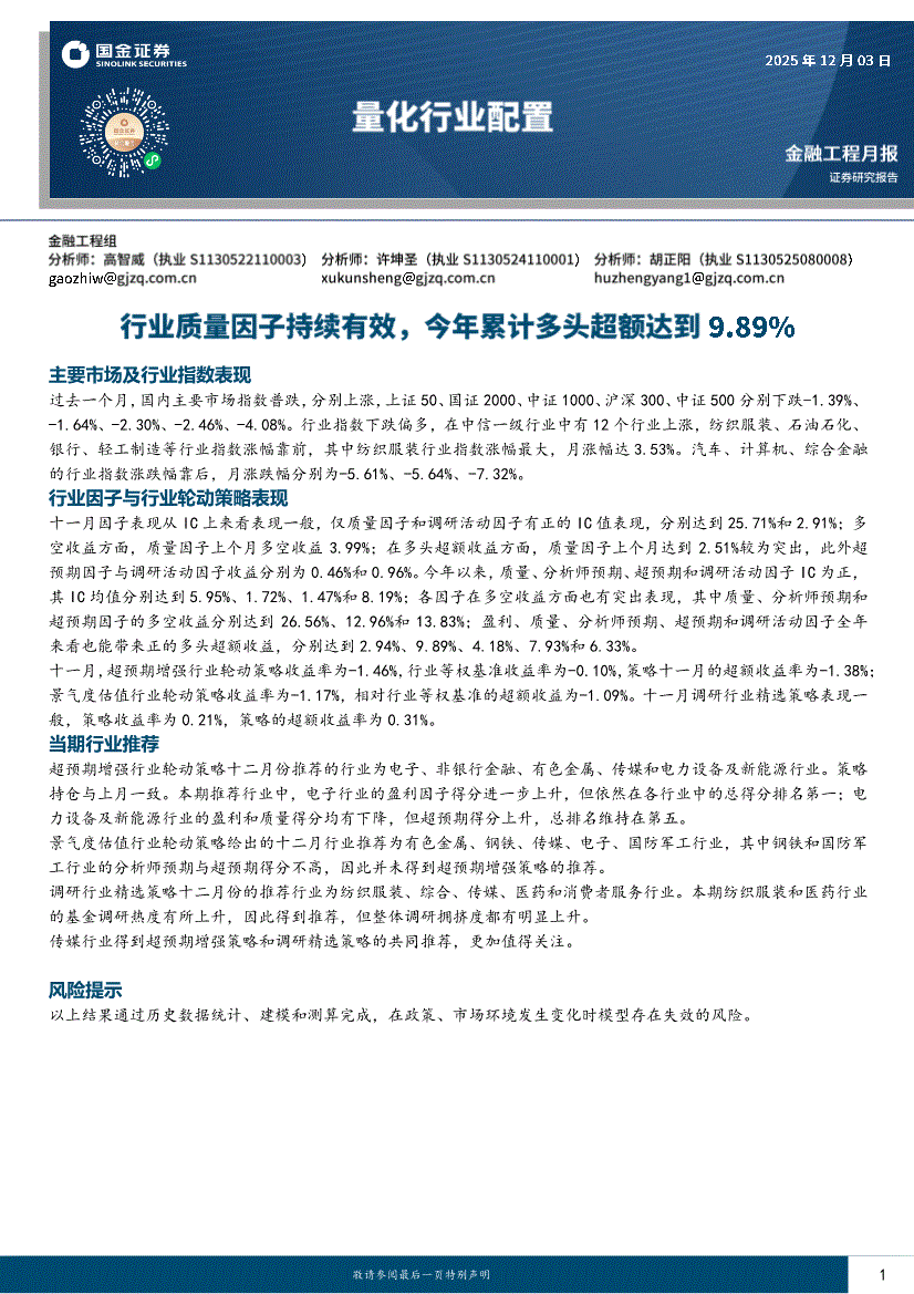 国金证券-量化行业配置:行业质量因子持续有效,今年累计多头超额达到9.89%-251203