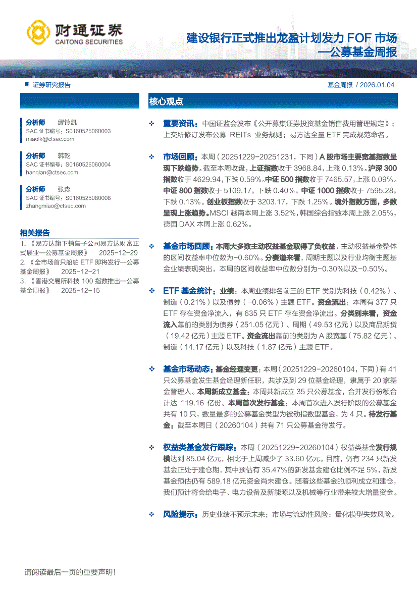 财通证券-公募基金周报:建设银行正式推出龙盈计划发力FOF市场-260104