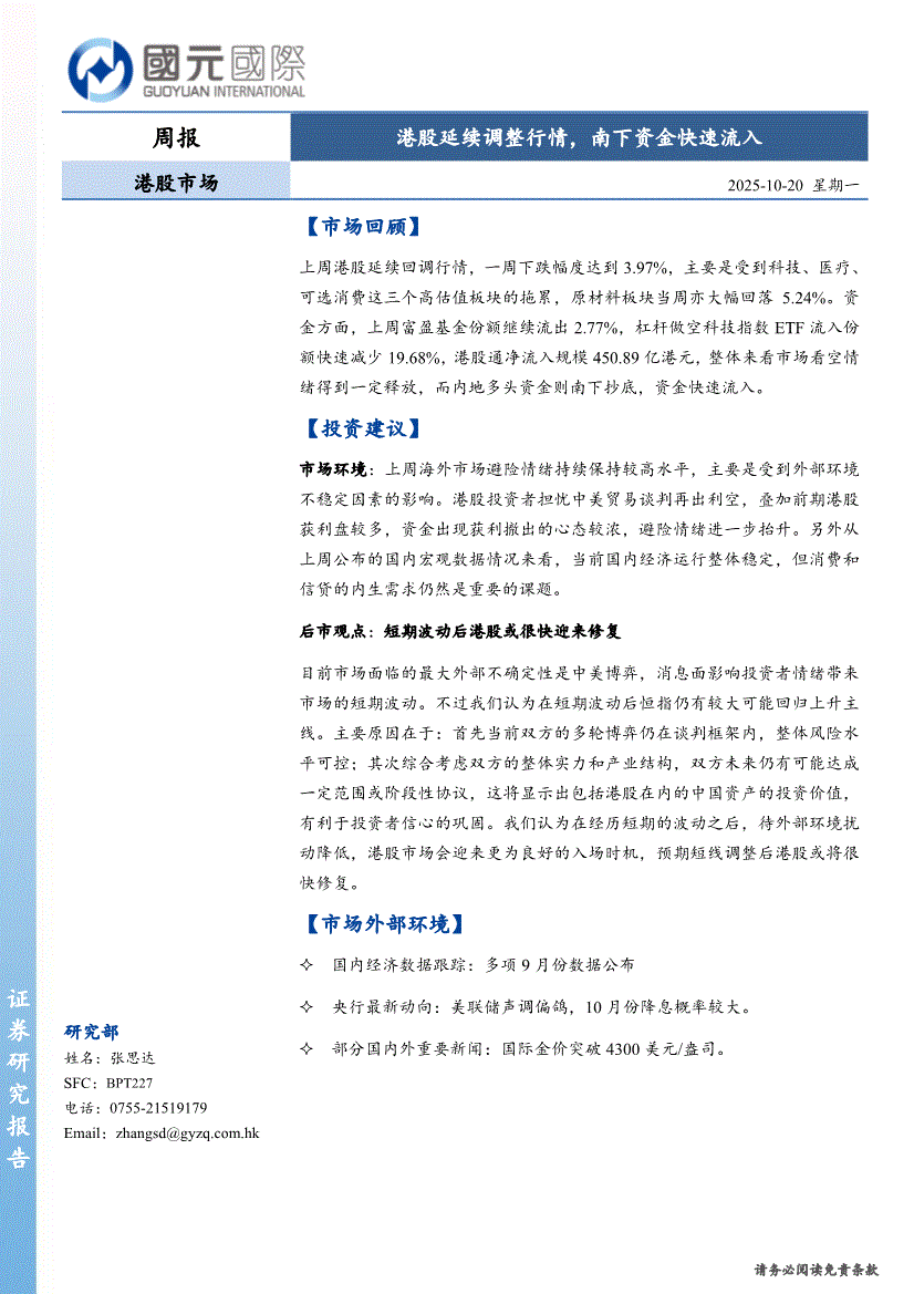 国元国际-港股市场周报:港股延续调整行情,南下资金快速流入-251020