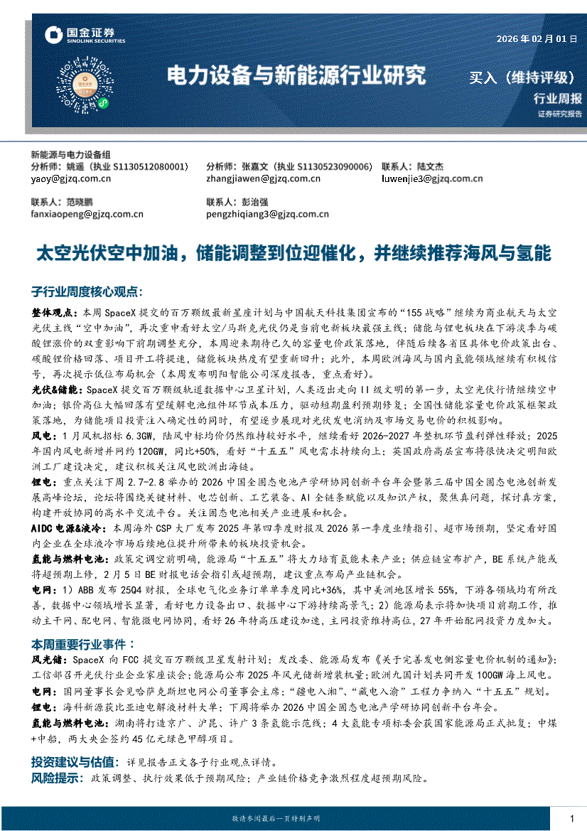 电力设备与新能源行业:国金证券-电力设备与新能源行业研究:太空光伏空中加油,储能调整到位迎催化,并继续推荐海风与氢能-260201